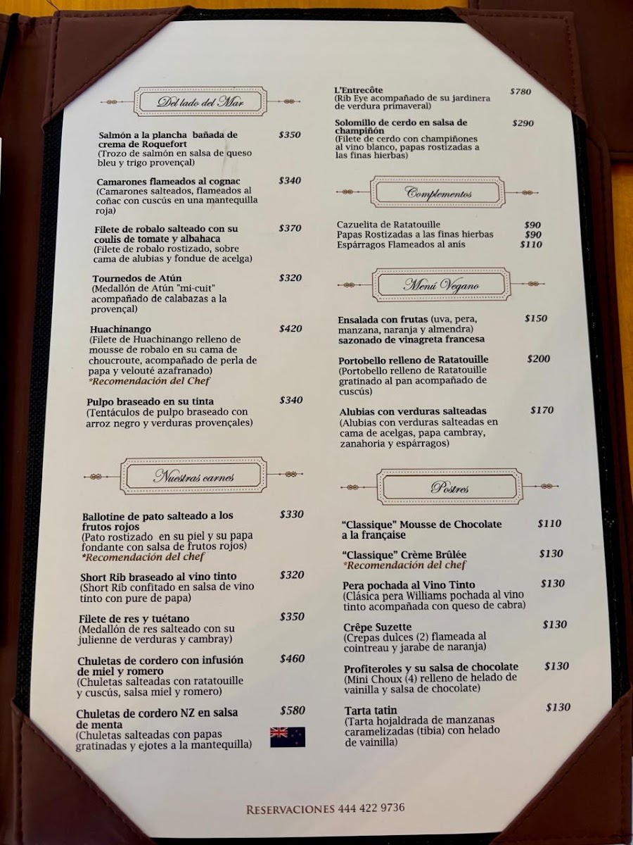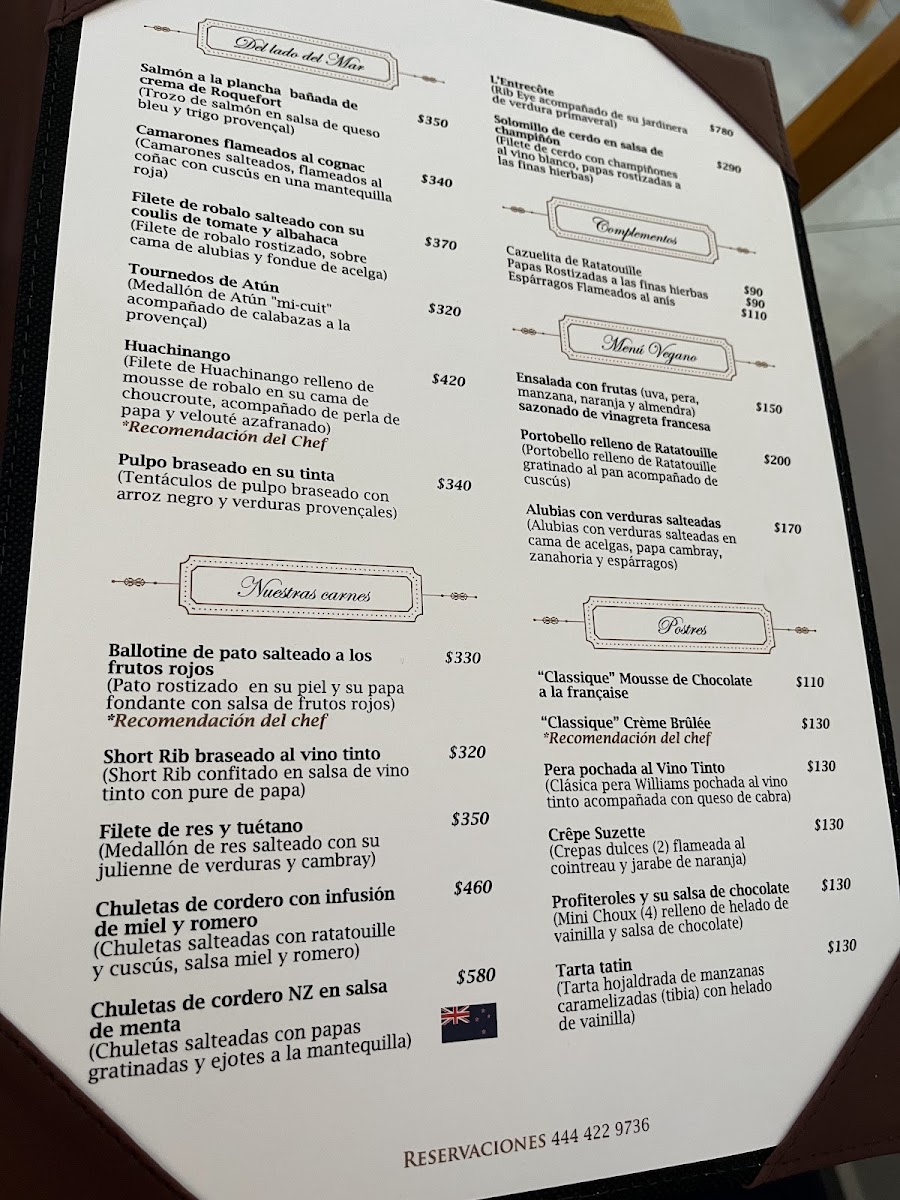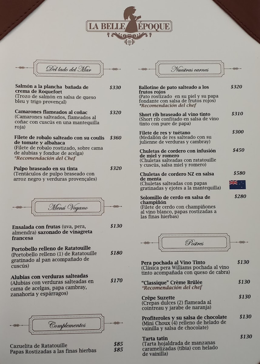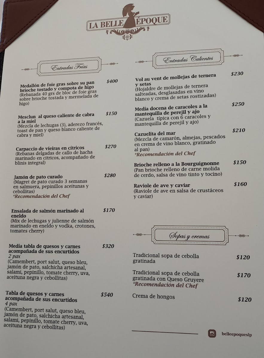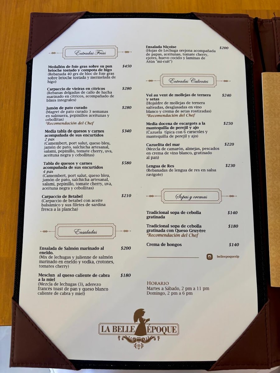 Restaurante La Belle Époque invites you to experience authentic French cuisine in the heart of San Luis Potosí. Nestled in a beautifully preserved historic casa, the menu reflects true culinary craftsmanship, blending traditional flavors with refined techniques. From tender, fall-apart short ribs drenched in rich, flavorful gravy to the delicately poached pear dessert that captivates with every bite, each dish tells a story of passion and precision.